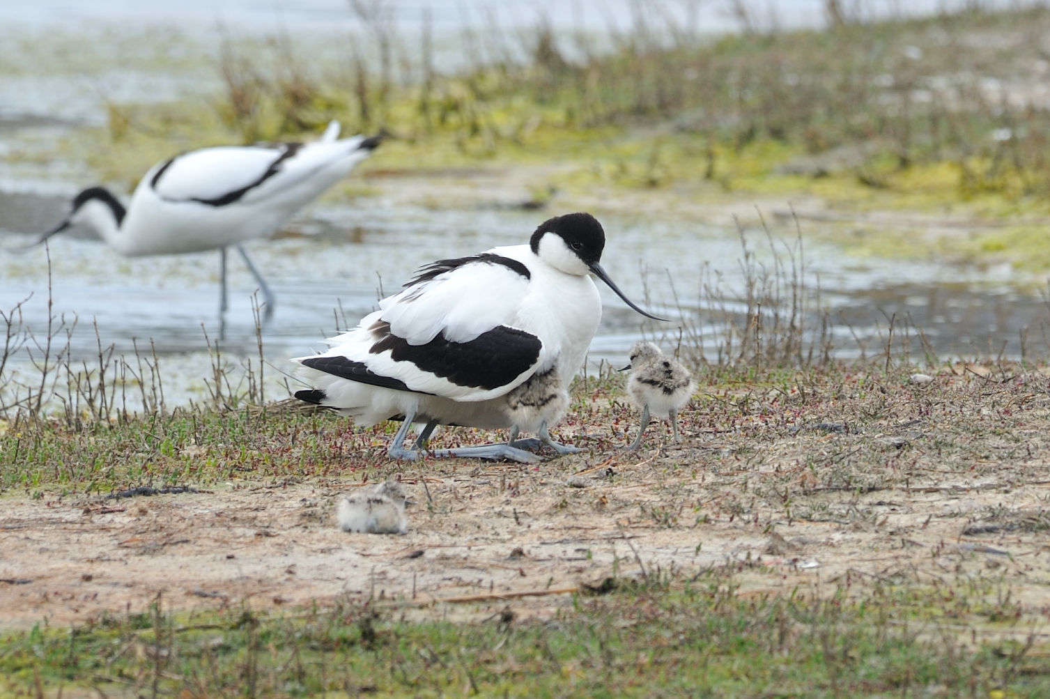 Avocette élégante couvrant ses poussins