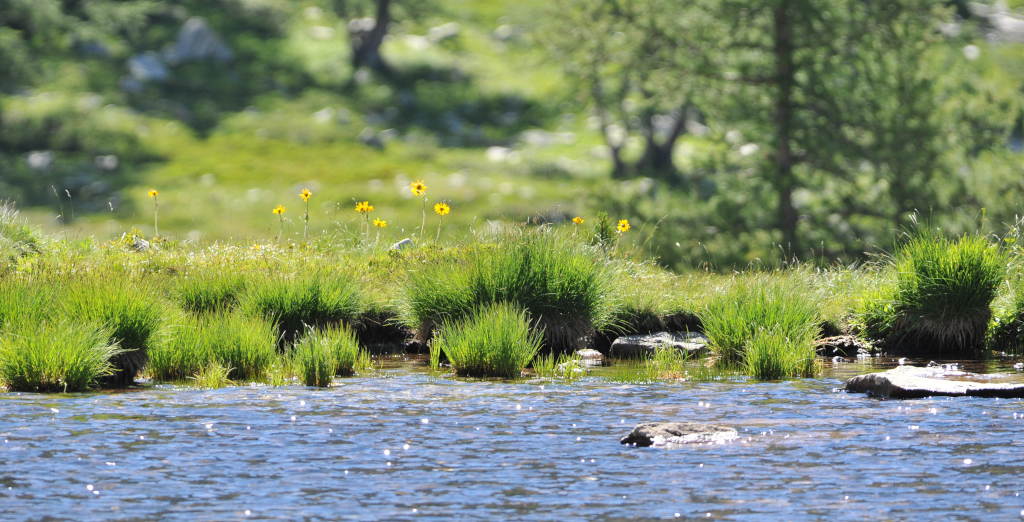 Dents-de-lion au bord d'une mare montagnarde